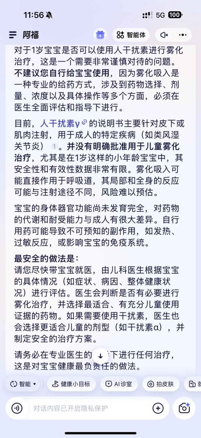 AI还详细解释了“人干扰素”的作用机制、适用场景、儿童用药潜在风险,甚至列出了几种替代药物的适用场景和注意事项。最终,陈女士带着AI的回复和前一位医生的处方,咨询了相熟的儿科医生朋友。对方也给出了相似的建议:症状轻微可先居家护理、观察情况,如果咳嗽加重或出现其他异常再立即复诊。
