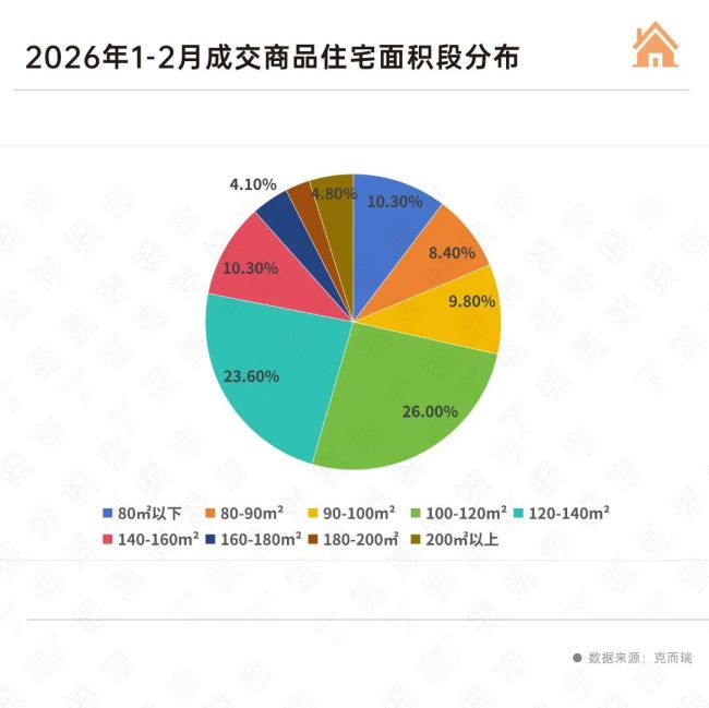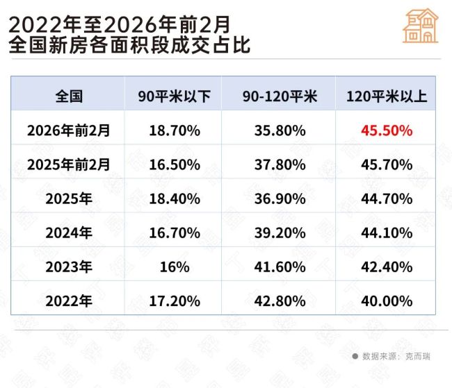 从近几年的新房成交走势来看,成交趋向大面积化已成为逐渐清晰的趋势。全国120平米以上新房成交占比从2022年的40%攀升至2025年的44.7%。2026年前两个月,每成交两套新房,就有一套是120平米的大户型。