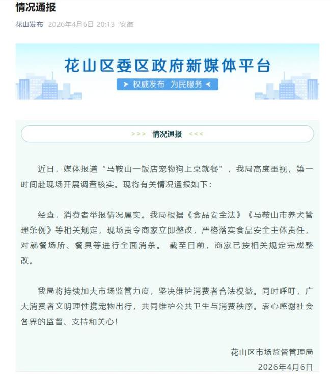 - 官方通报“宠物狗上桌就餐” 商家已整改完成