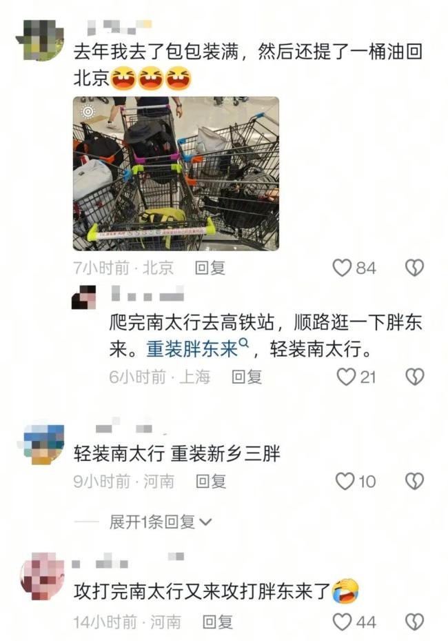 相关视频的评论区里,网友们调侃道:“轻装南太行,重装胖东来”、“南太行真正的终点是胖东来”。