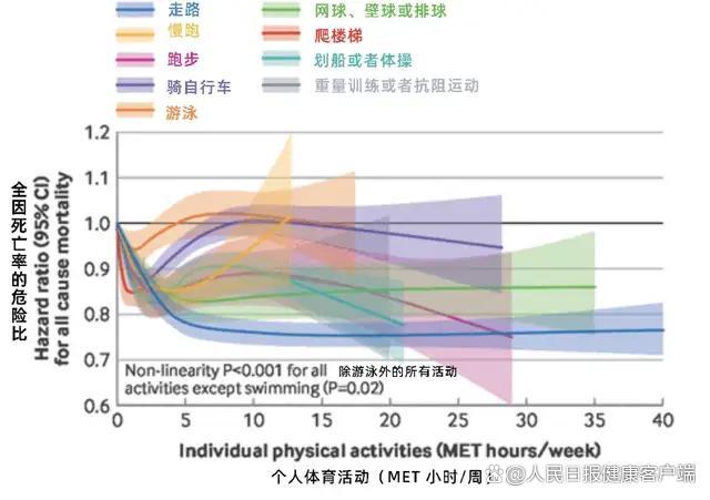 各种运动在降低全因死亡风险方面:走路可降低17%;网球、排球可降低15%;划船、体操可降低14%;力量训练和跑步可降低13%;慢跑可降低11%;爬楼梯可降低10%;骑自行车可降低4%。