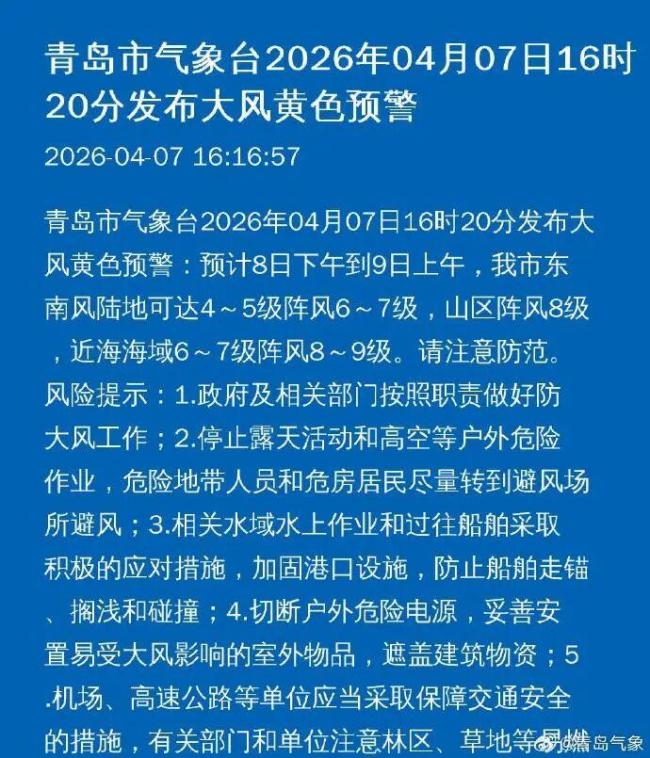 青岛市气象台还发布了大风黄色预警,预计8日下午到9日上午,青岛市东南风陆地可达4~5级阵风6~7级,山区阵风8级,近海海域6~7级阵风8~9级,请注意防范。