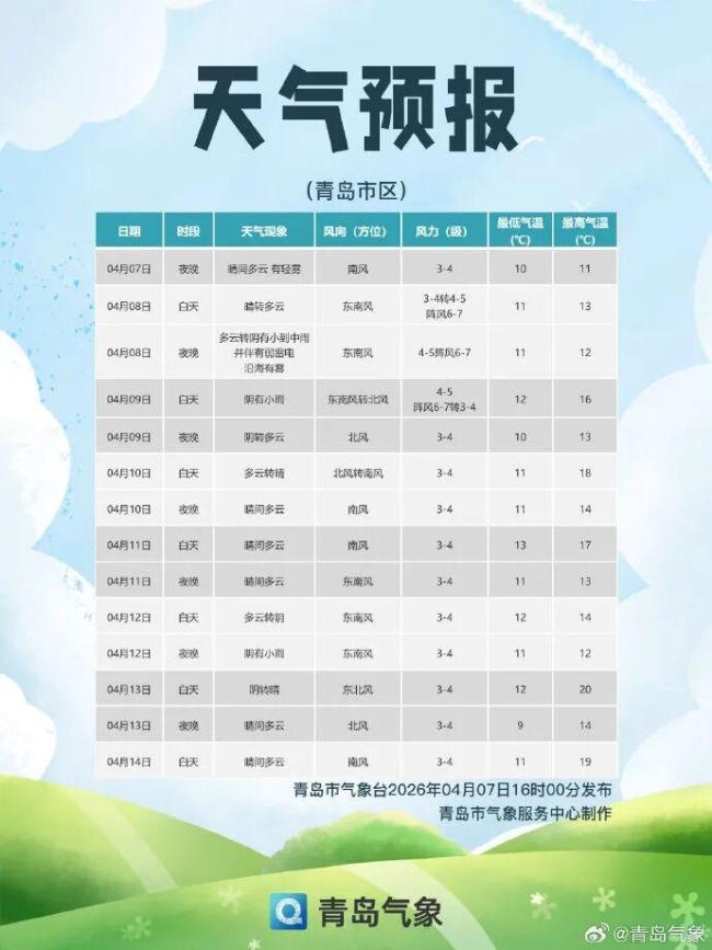 青岛市区天气预报如下:今天夜间晴间多云,有轻雾,南风3到4级;明天白天晴转多云,东南风3到4级转4到5级阵风6到7级,相对湿度50%-85%,最低气温10℃,最高气温13℃。8日夜间到9日白天多云转阴有小到中雨并伴有弱雷电,沿海有雾,东南风4到5级阵风6到7级转北风3到4级,气温11到16℃。9日夜间到10日白天阴转晴,北风转南风3到4级,气温10到18℃。
