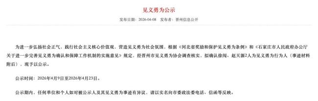 4月8日晚,河北晋州市政府官网发布《见义勇为公示》,拟确认徐闯、赵天源两人为见义勇为行为人。徐闯出生于1990年11月,是晋州市晋州镇西紫城村人;赵天源出生于2007年8月,来自晋州市小樵镇泥安村。