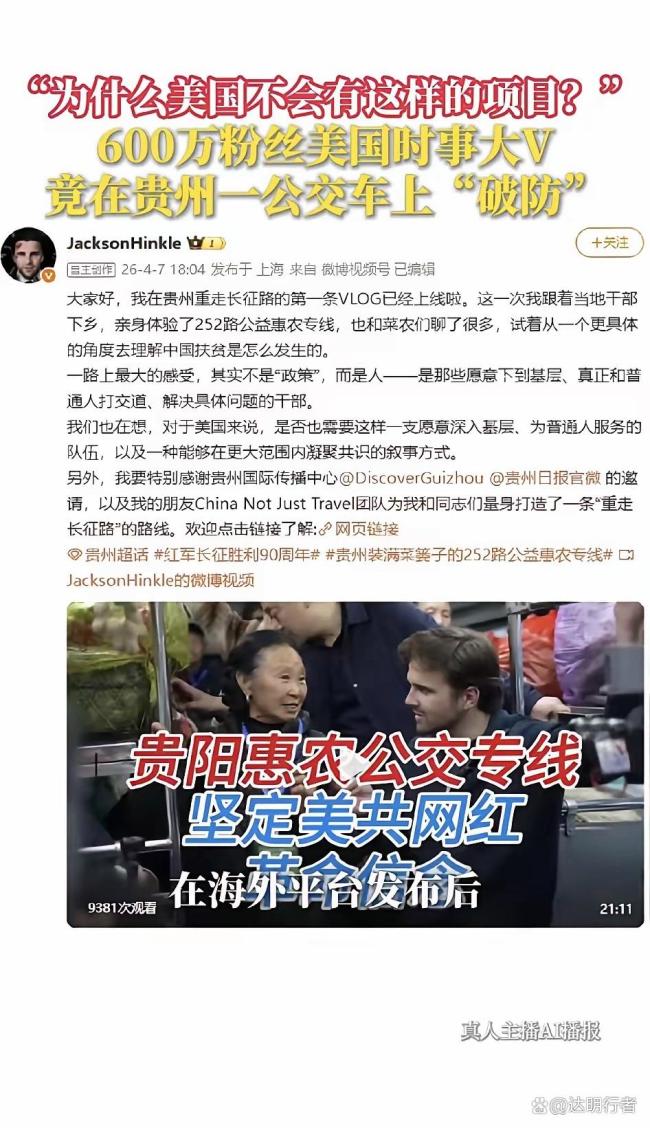 美国时事博主Jackson Hinkle在贵州贵阳的一趟早班公交上,发出了一句让全网深思的灵魂拷问:“为什么美国不会有这样的项目?”他镜头下的252路“惠农专线”,没有豪华设施,没有宏大叙事,却装满了新鲜蔬菜、菜农的笑脸,以及最朴素的中国民生温度。这条专线以最接地气的方式向世界展示什么叫“以人民为中心”。